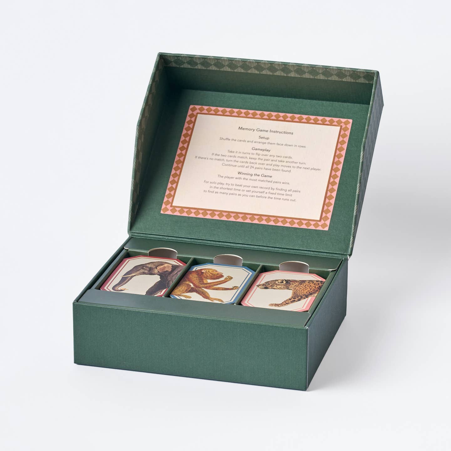 Includes 48 illustrated playing cards (x24 pairs) stored in a premium quality flip-top card-hinged box.
