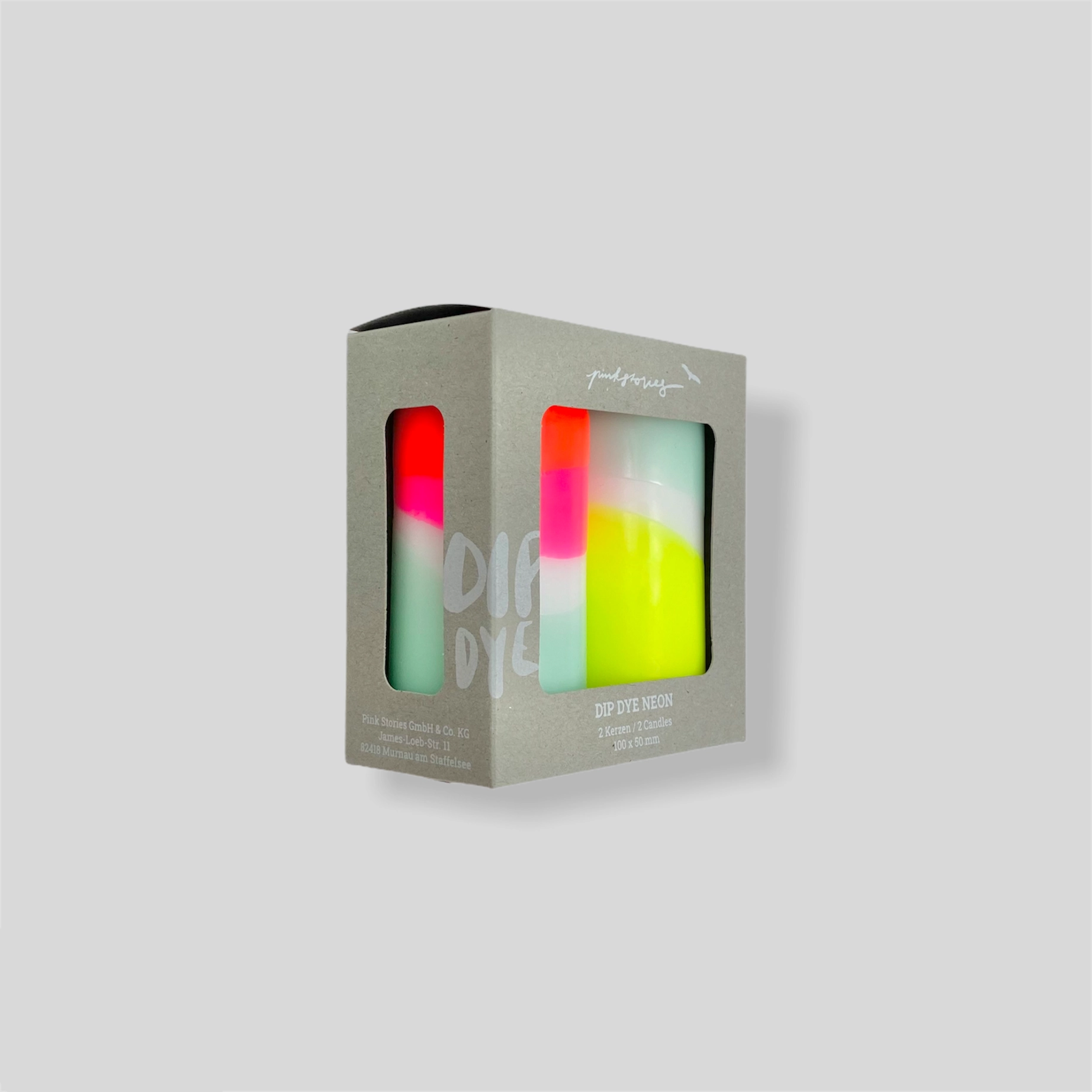 Set of two lovingly hand-dyed pillar candles in fab neon colours.