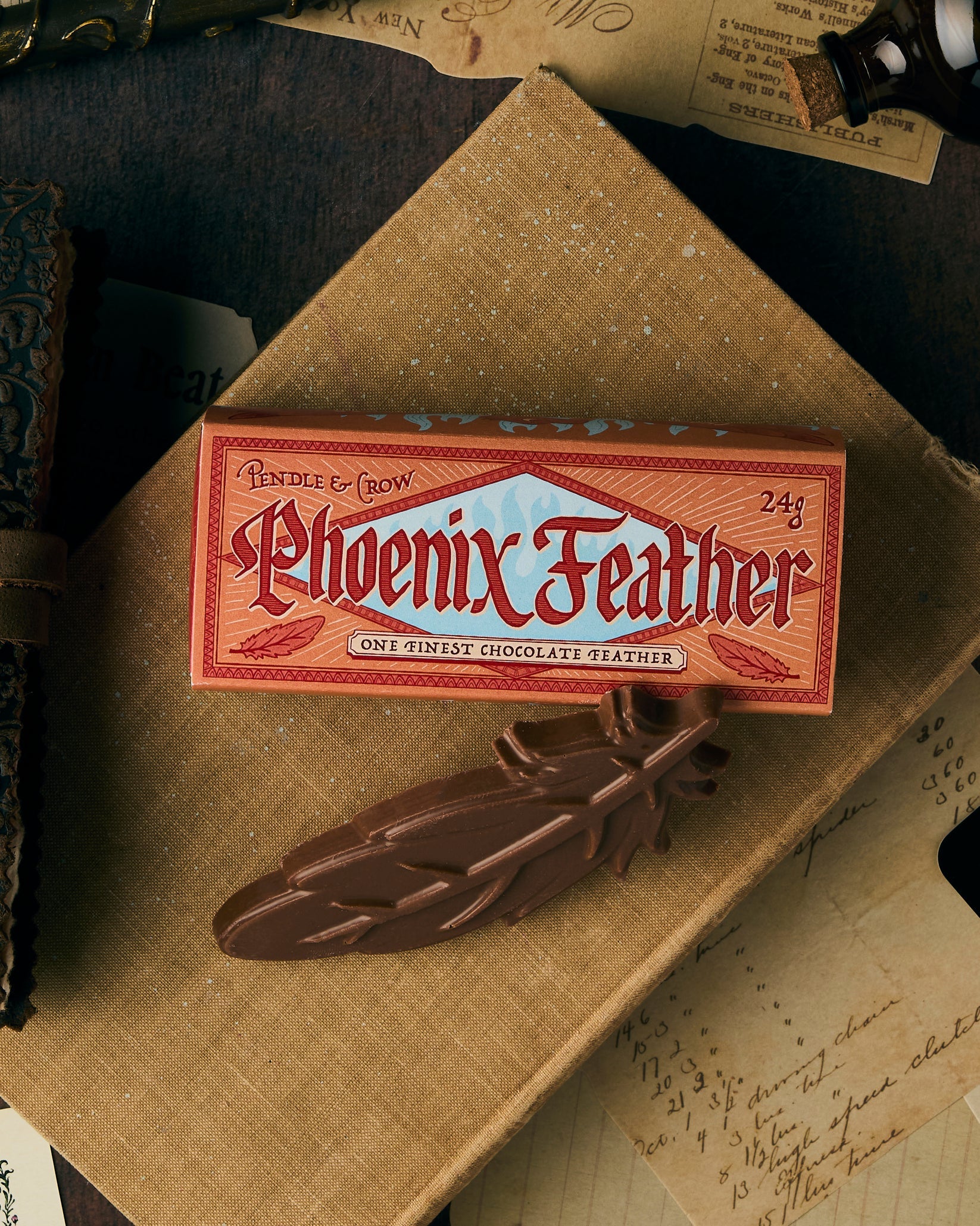 A single phoenix feather, cast in the finest solid milk chocolate and said to carry a spark of fire within.
